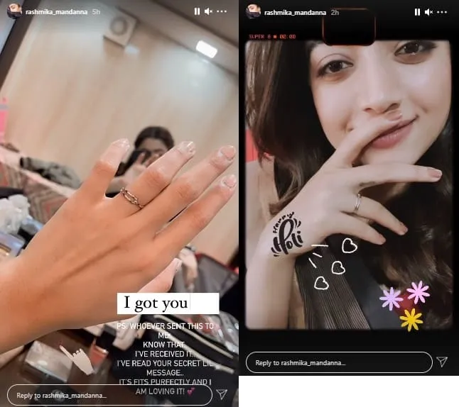 Rashmika Mandanna created quite a stir a day ago when she flaunted a beautiful ring on her ring finger. The post triggered a lot of speculations with many imagining it to be a gift from her new boyfriend.