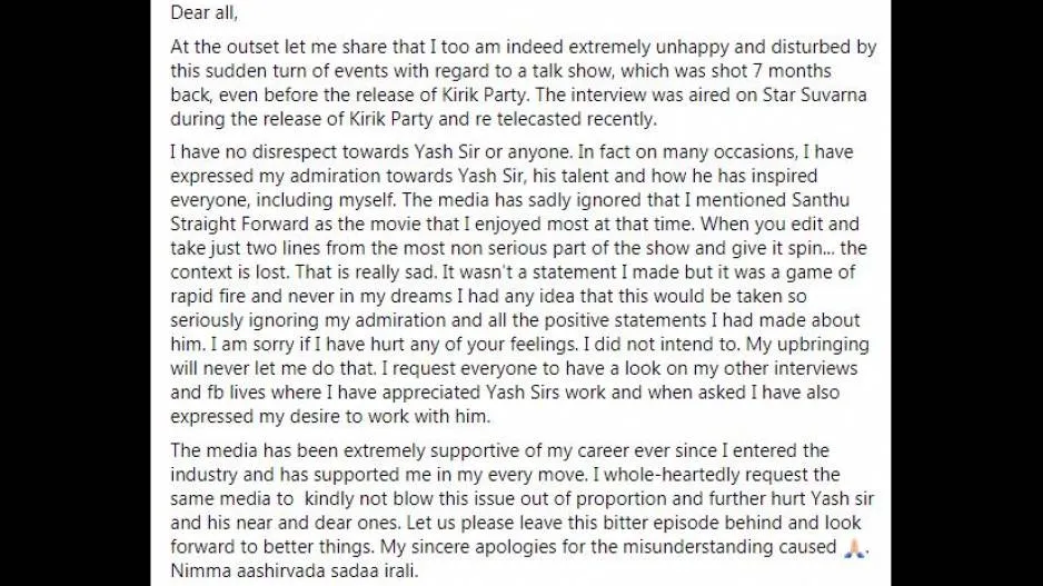 After facing the wrath of Yash's fans, Rashmika posted an apology note on her Facebook handle. The actress in her long note clarified that it was a fun interview and didn't intend to hurt anyone's sentiment.